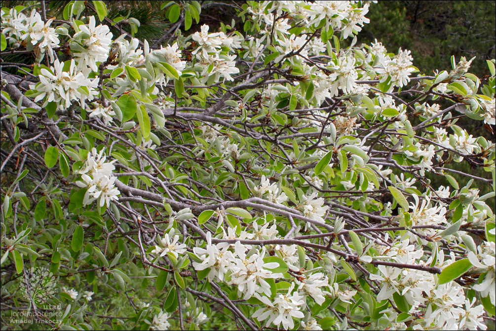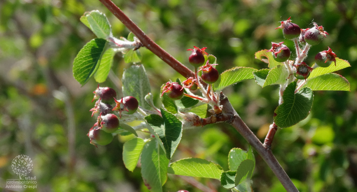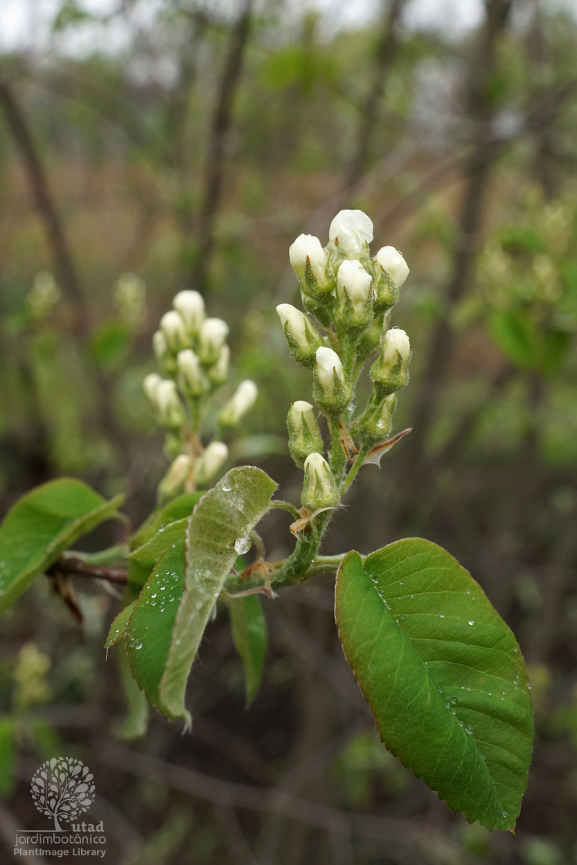 Arbusto de crescimento moderado com folhagem caduca e folhas simples alternas de forma ovada. Flores branco. Fruto do tipo pomo negro-azulado.