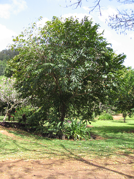 Árvore de fruto de crescimento moderado com undefined e folhas simples de forma oblonga a lanceolada. Flores amarelo-esverdeado. Fruto do tipo sincarpo.