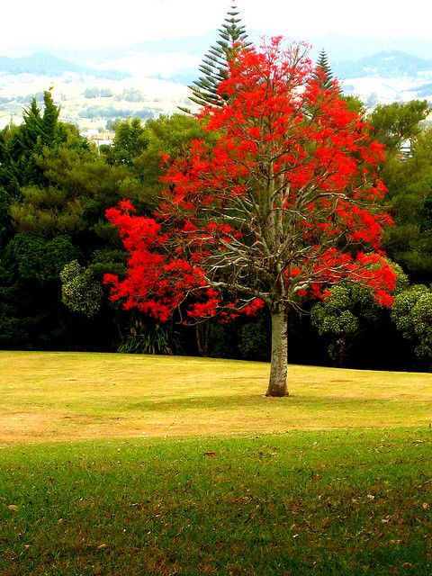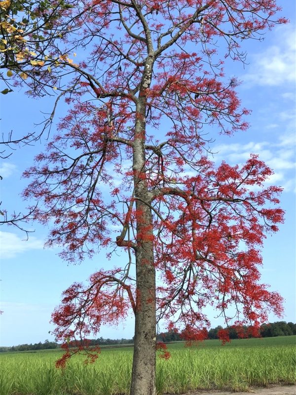 Árvore de crescimento moderado com folhagem caduca e folhas simples de forma palmatilobada. Flores vermelho escarlate. Fruto do tipo folículo.