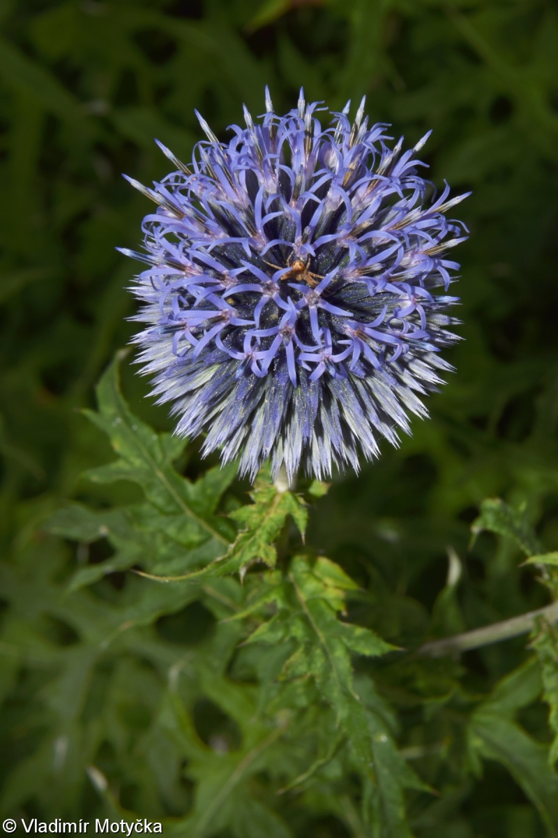 Herbácea de crescimento moderado com folhagem perene e folhas simples alternas de forma pinatissecta espinhosa. Flores azul-metálico. Fruto do tipo aquénio.