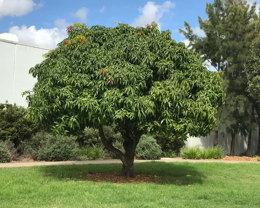 Árvore de fruto de crescimento moderado com folhagem perene e folhas simples de forma lanceolada alongada. Flores rosa-amarelado. Fruto do tipo drupa grande.