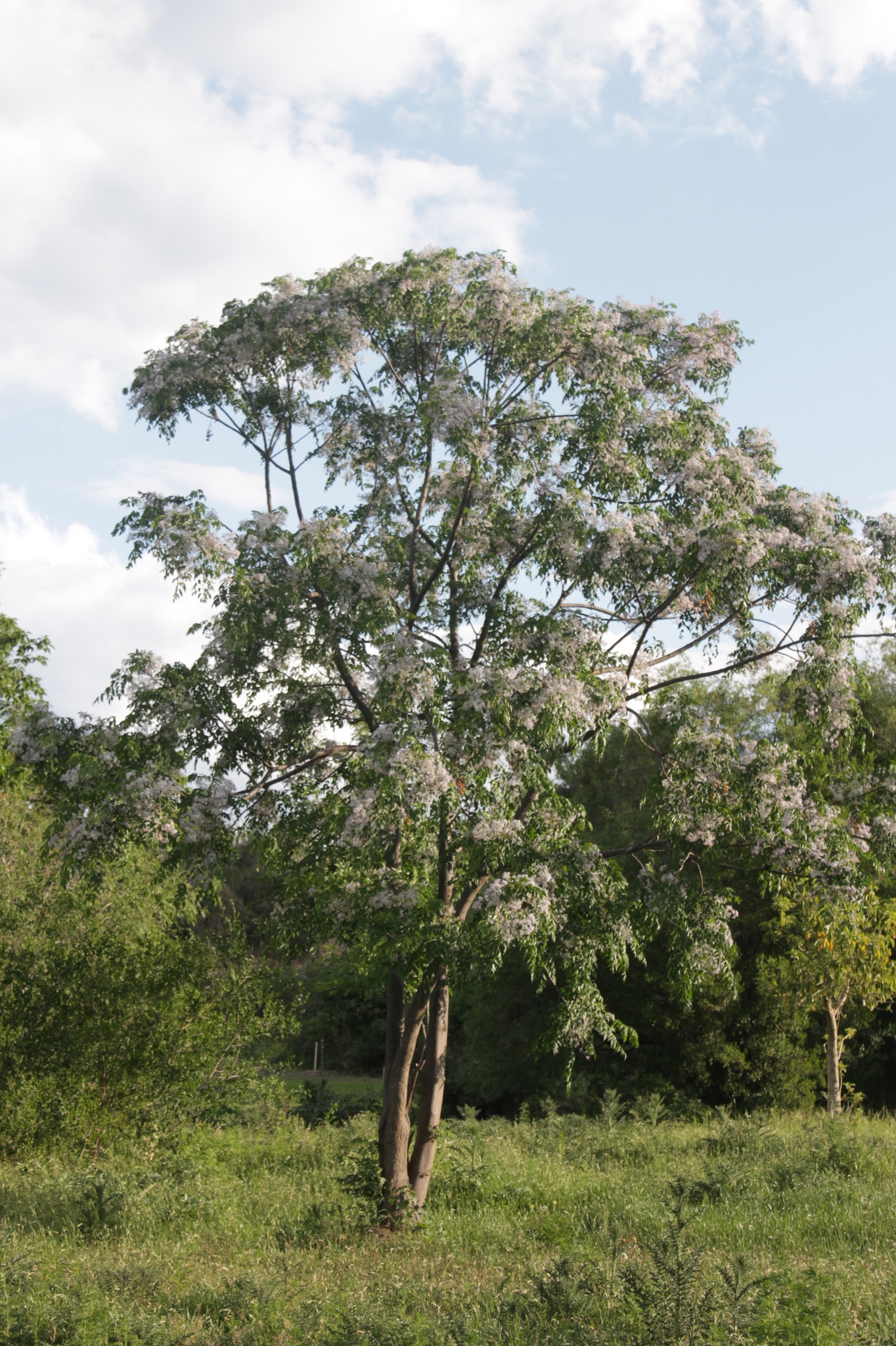 Árvore de crescimento rápido com folhagem caduca e folhas composta bipinadas de forma folíolos ovado-lanceolados. Flores lilás. Fruto do tipo drupa.