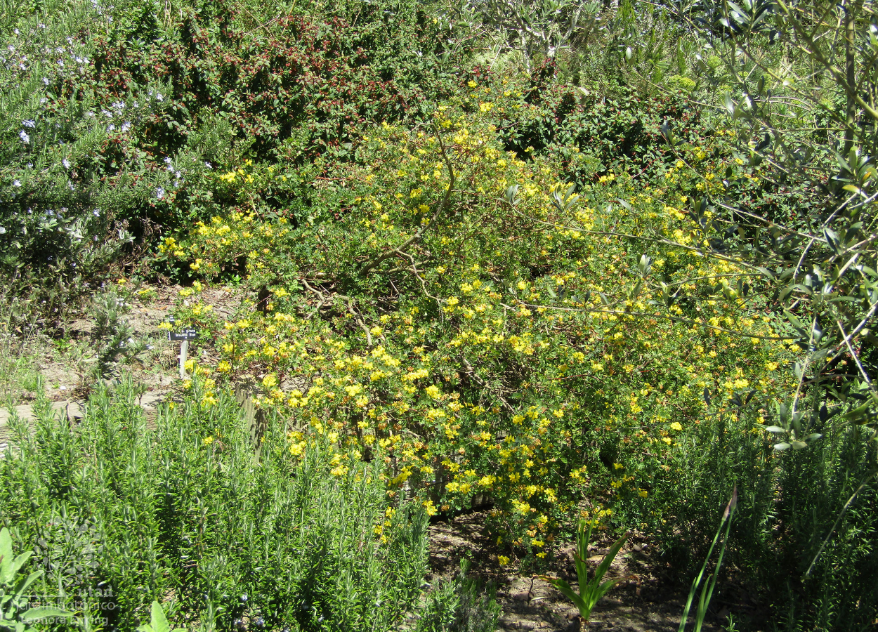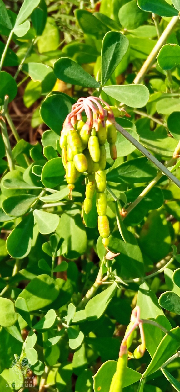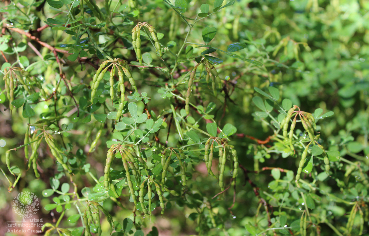 Arbusto de crescimento moderado com folhagem perene e folhas composta imparipinadas de forma folíolos pequenos. Flores amarelo intenso. Fruto do tipo lomento.