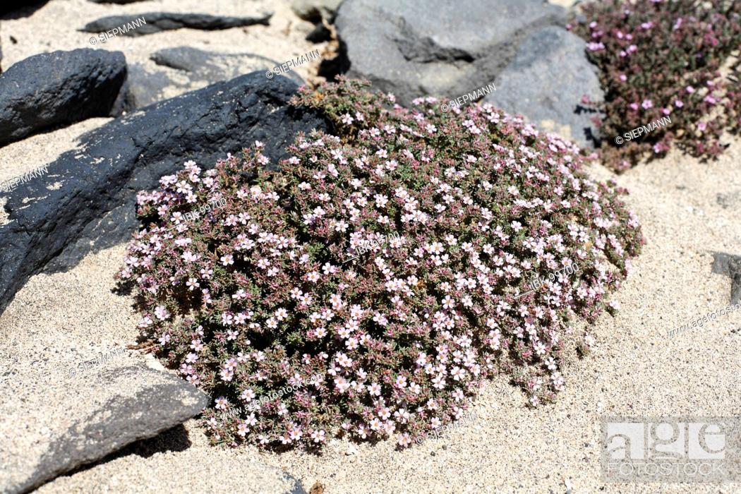 Herbácea de crescimento lento com folhagem perene e folhas simples opostas de forma linear pequena. Flores rosa-lilás. Fruto do tipo cápsula.