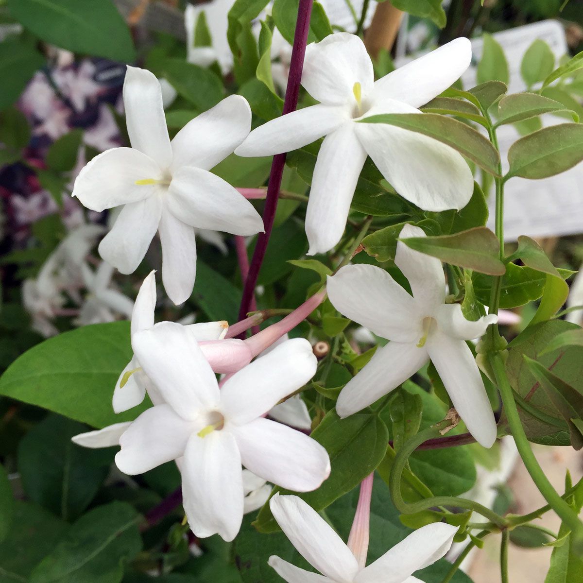 Trepadeira de crescimento moderado com folhagem perene e folhas simples opostas de forma ovada-lanceolada. Flores branco perfumado. Fruto do tipo folículo.