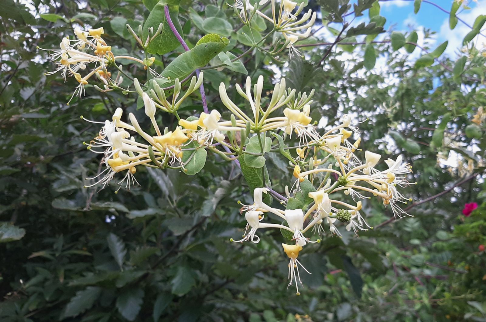 Trepadeira de crescimento rápido com undefined e folhas simples opostas de forma ovada. Flores creme-rosado perfumado. Fruto do tipo baga vermelha.